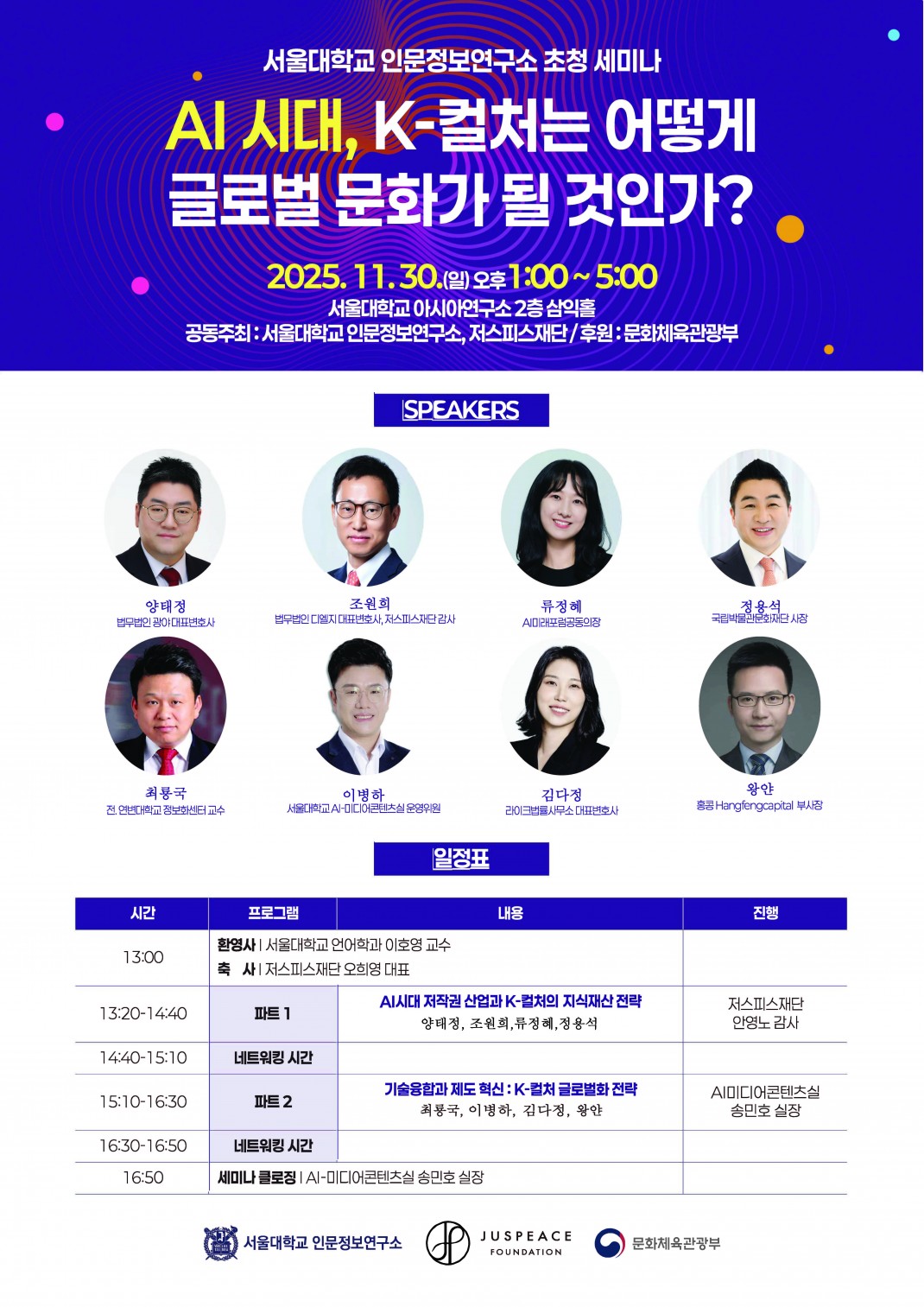 서울대학교 인문정보연구소가 초청한 이번 세미나는 "AI 시대, K-컬처는 어떻게 글로벌 문화가 될 것인가?" 라는 시의적절하고 중요한 주제로 진행되었습니다. 문화체육관광부와 지드래곤의 저작권 기부를 통해 설립된 저스피스재단이 후원하고 공동주최한 이번 행사에서, 양태정 변호사는 K-컬처의 지속 가능한 성장을 위한 법률적 해법을 제시했습니다.